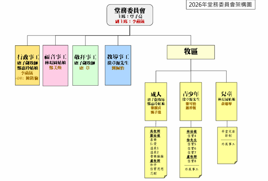 堂會架構2026 2026年度堂務委員會各崗位名單 主席:覃子亮 副主席:李燕儀 當然委員(傳道同工)︰ 盧子劍牧師、吳桂英牧師、 徐章源牧師、林璟園姑娘、 鄭惠玲姑娘 行政事工:李燕儀、陳銘愉(司庫) 成人牧區:黎浚貞、甄子進 青少年牧區:黎可怡、羅子恆 兒童牧區:余瑞琴 敬拜事工:盧葦 教導事工:劉佩怡 福音事工:鄭美煥